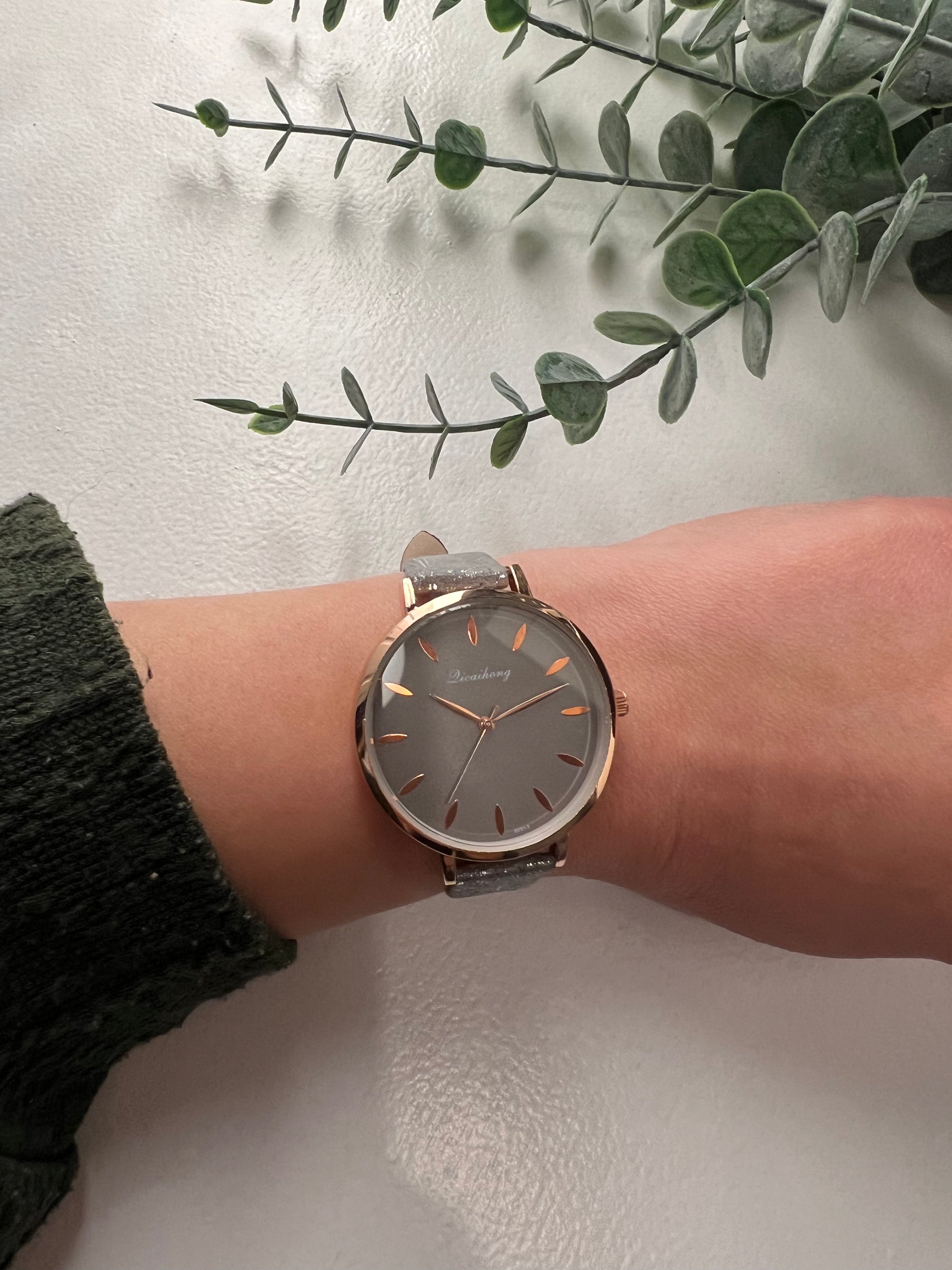 Eine elegante Uhr mit grau-silbernem Armband und rosé-goldenen Zeigern.