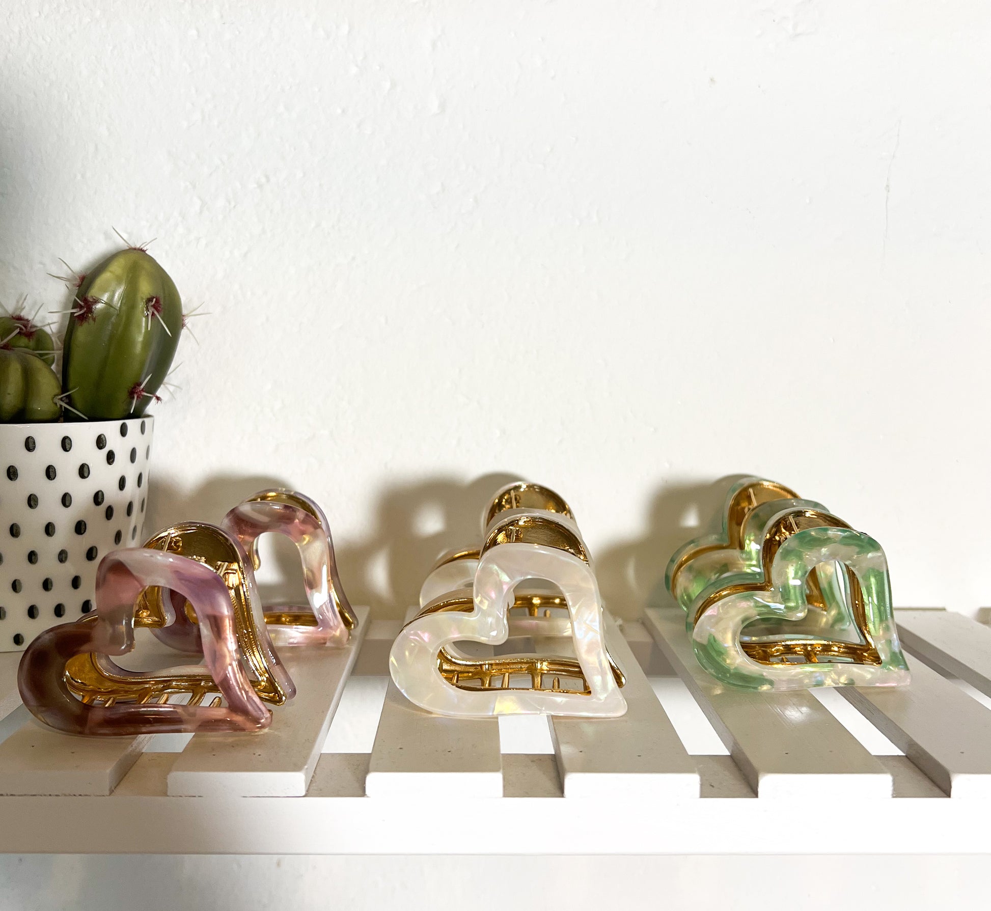 Verleihen Sie Ihrem Haarstyling einen Hauch von Eleganz und Charme mit diesen wunderschönen herzförmigen Haarklammern! Die Klammern bestehen aus hochwertigem, schimmerndem Acryl in zarten Pastelltönen – Rosa, Perlmutt und Grün – und sind mit goldfarbenen Details veredelt. Dank der stabilen Metallfeder bieten sie zuverlässigen Halt für verschiedenste Frisuren, egal ob Hochsteckfrisur, Half-Up oder ein lässiger Dutt.
